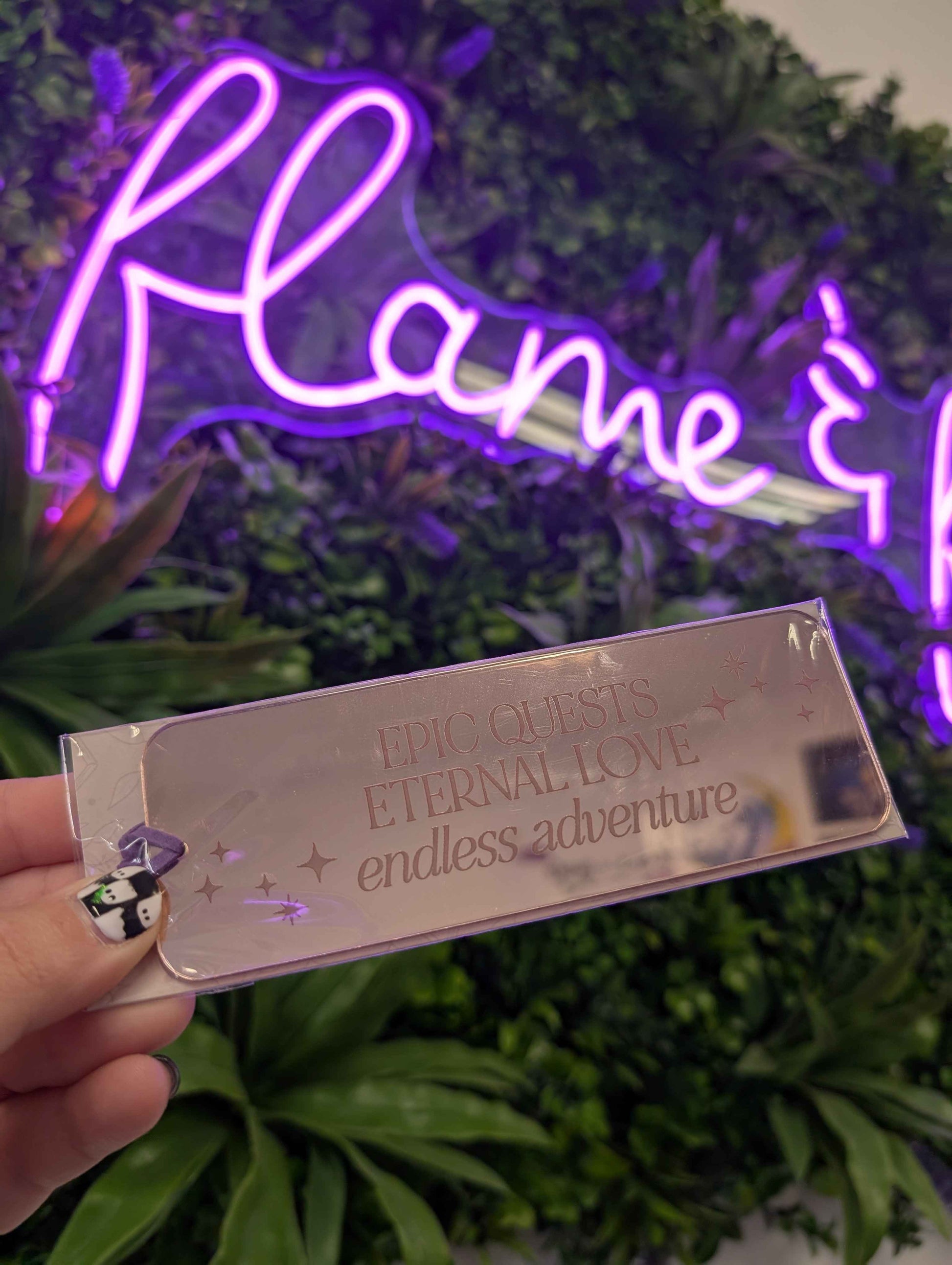 Flame & Fable's store slogan on acrylic bookmarks created by Between the Ink. Available in three colors: blush mirror, iridescent, and moon beam.